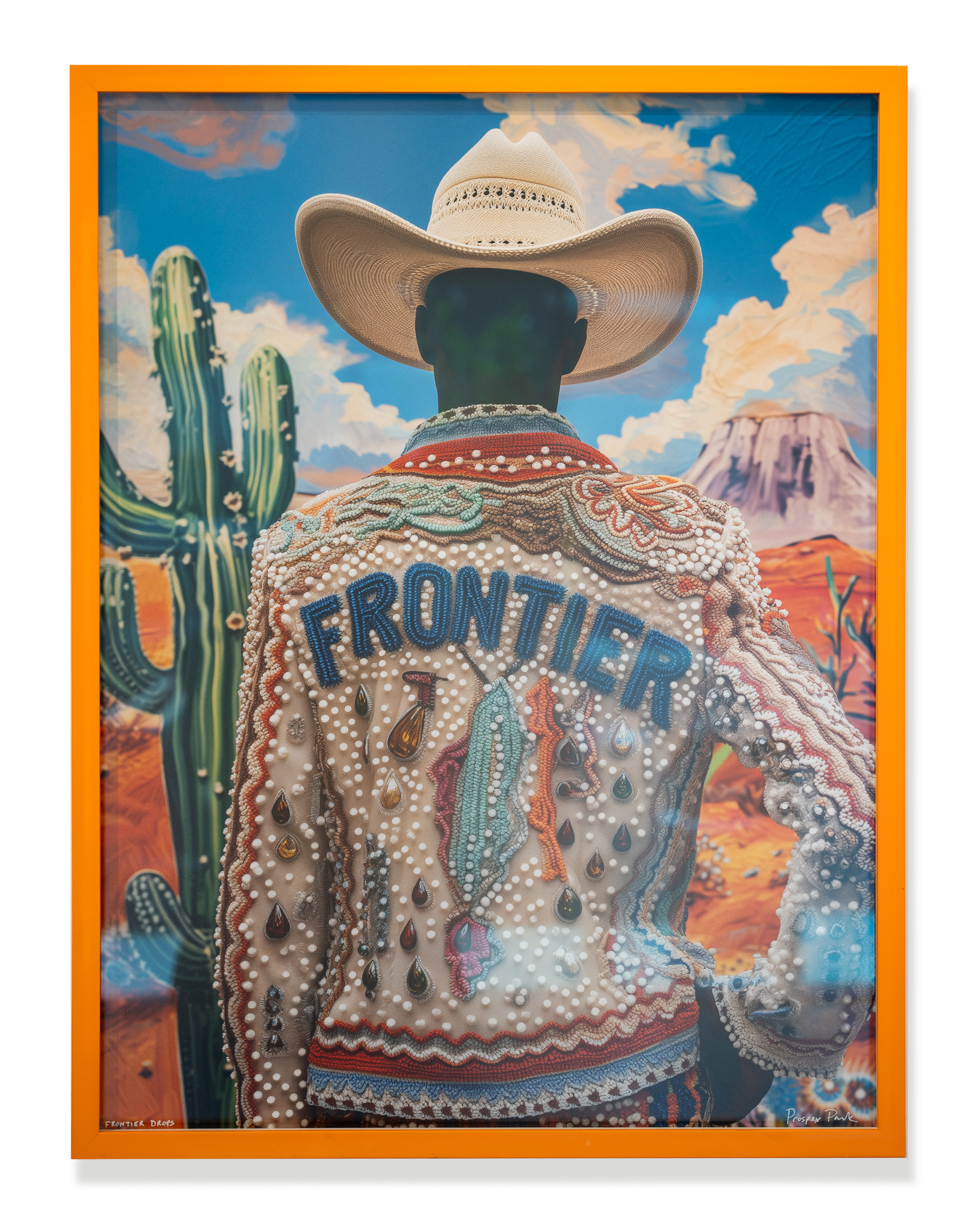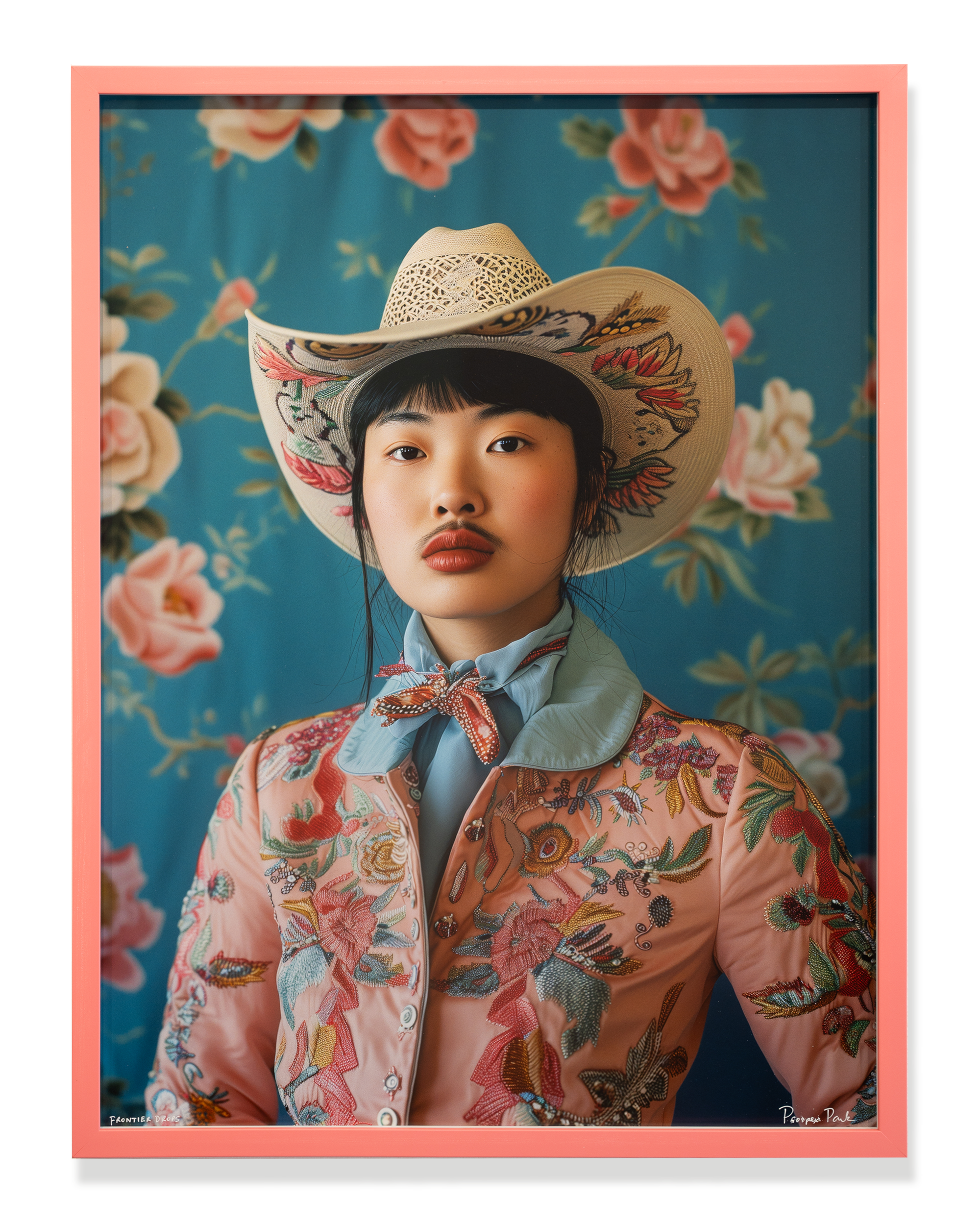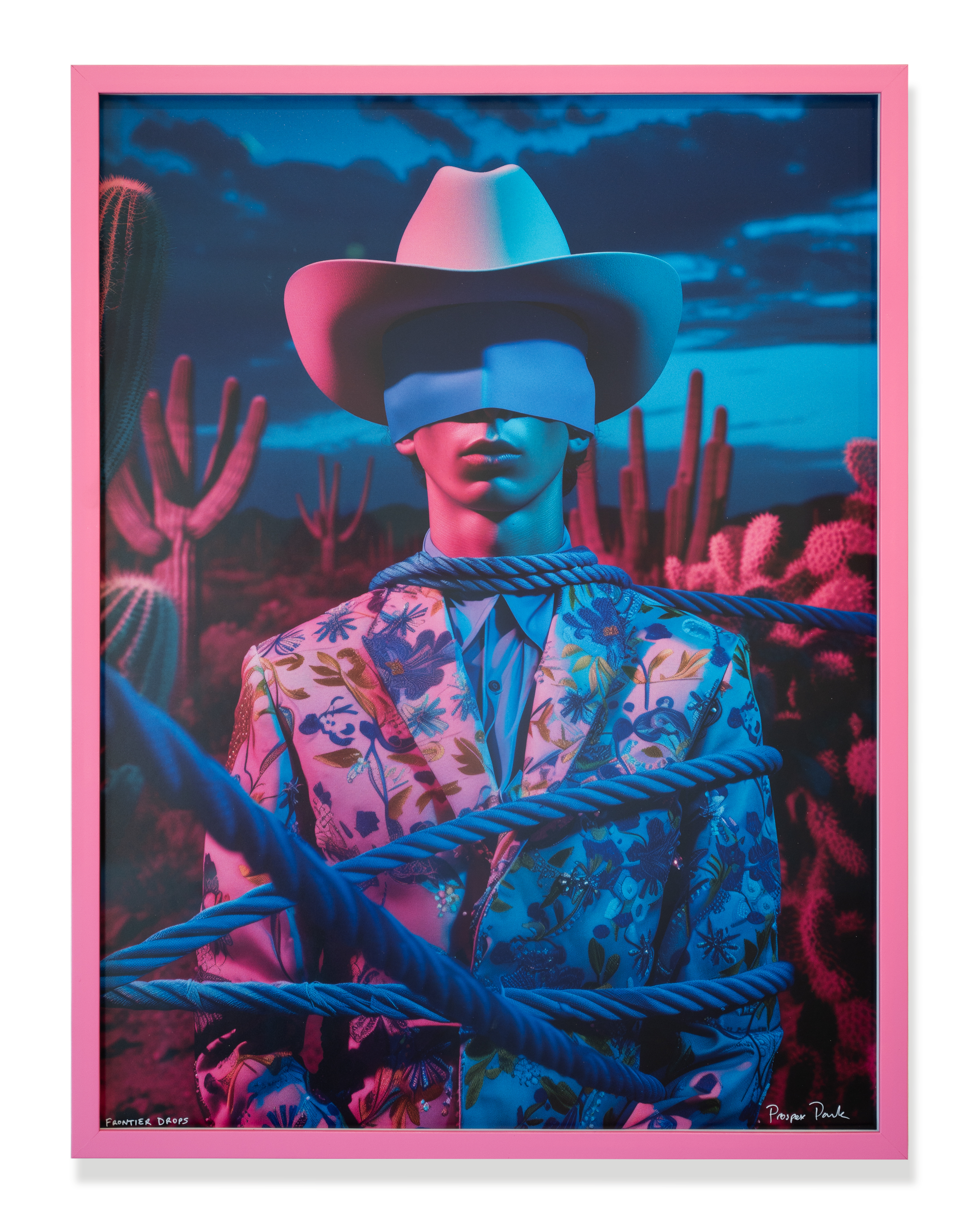 What set FRONTIER DROPS apart is Prospex’s use of generative AI to challenge conventional norms of strength and masculinity on the frontier. Through diverse and queer subjects, he invites viewers to reconsider their perceptions of this storied era.